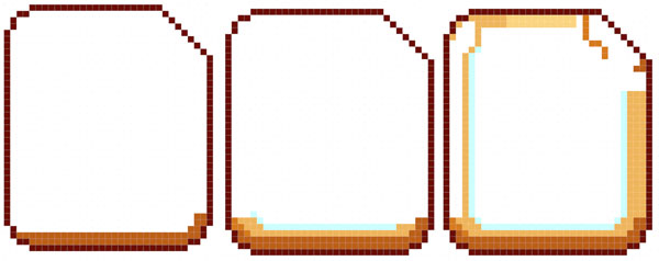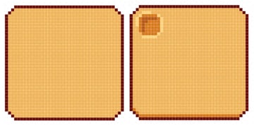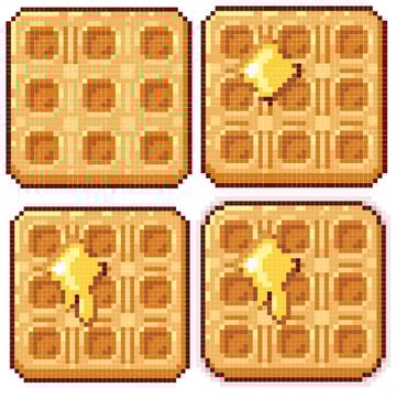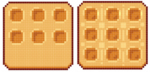 The waffle's shape is fairly simple: A rounded square. Initially, I chose to keep the corners at two diagonal pixels so the waffle kept a very square shape. Later, I changed it to two horizontal, one diagonal, and two vertical pixels for the corners.