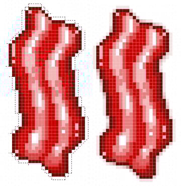 For an easier way to add an outline, use the Magic Wand Tool (W) to select outside of the bacon icon. Go to Select > Modify > Contract and enter 1 pixel. Invert the Selection (Shift-Control-I). Create a New Layer below the bacon layer, in the Layers panel and fill your selection with Dark Brown at 30% Opacity. Stack translucent brown pixels in the corners to soften the edges of the bacon icon. When satisfied, Merge (Control-E) selected bacon layers, in the Layers panel.