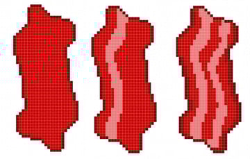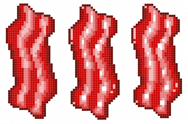Add highlights to the stripes with White at 30%, 20%, and 100% Opacity. For little shiny bits to the bacon, add a few pixels around the edges at 80% Opacity.