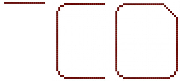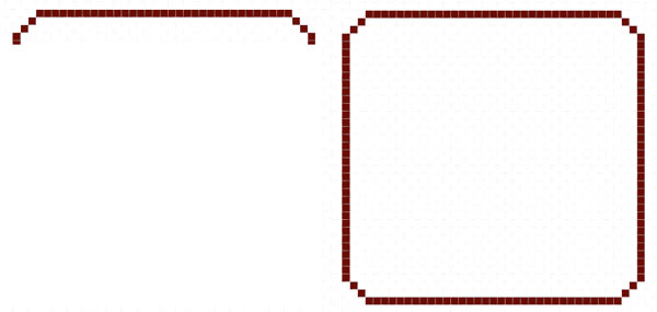 The left corner is abrupt at six pixels down, four diagonal to the left, seven pixels down, three down, and finally, four down.