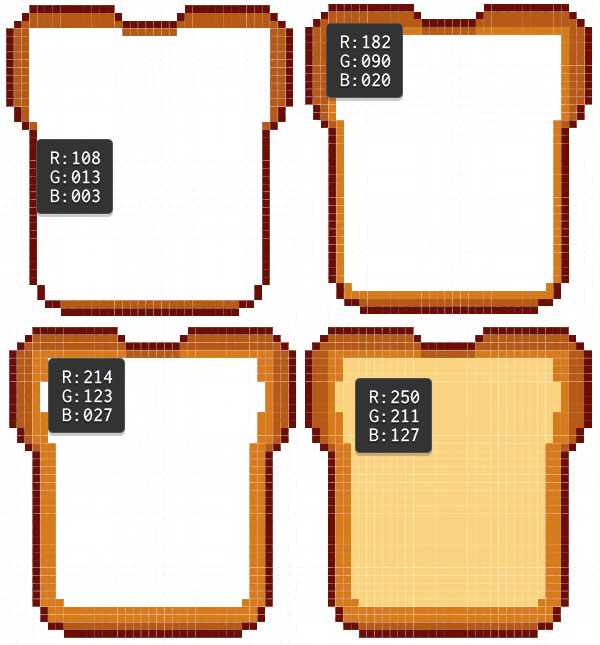 - Select Dark Brown for your pencil color, and reduce the opacity to 30-50%. Outline the toast, with darker colors placed in the corners of the pixel shape, in order to soften up the stark edge.