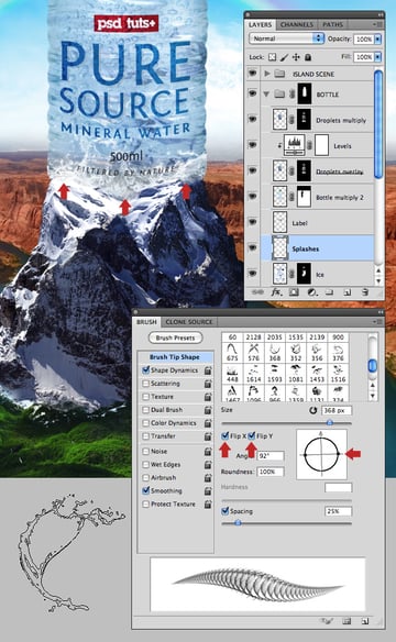 Add a new layer called "Splashes" above the "Ice" and set your Foreground color to white. Now use an assortment of these water brushes to add some swirling movement within the bottle base.