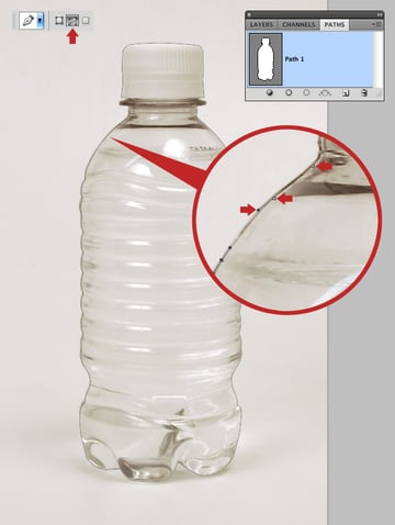 Open the bottle, then set the Pen Tool (P) to Paths in the Options bar. Zoom in and carefully plot a closed path fractionally inside the bottle shape.