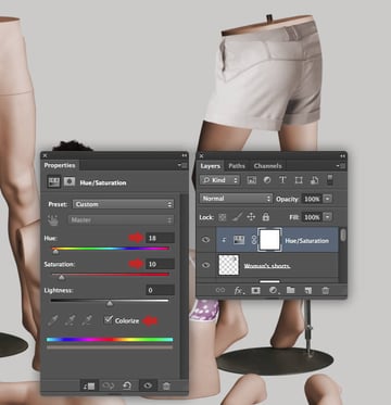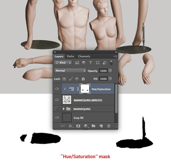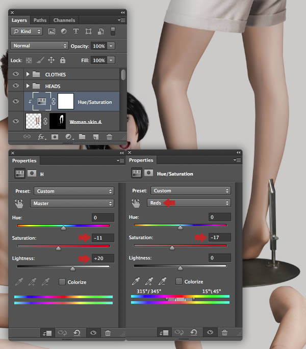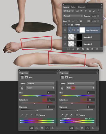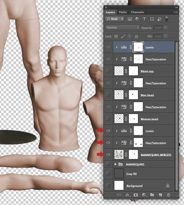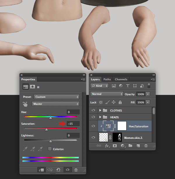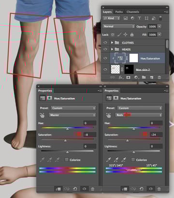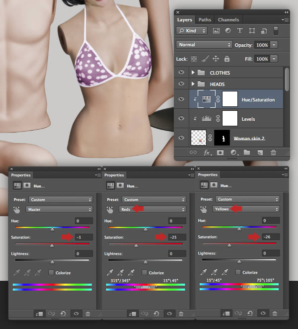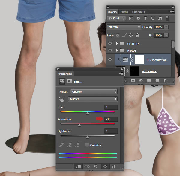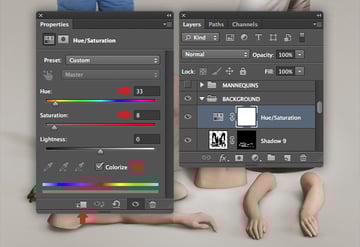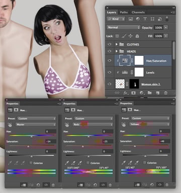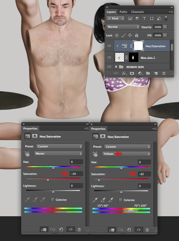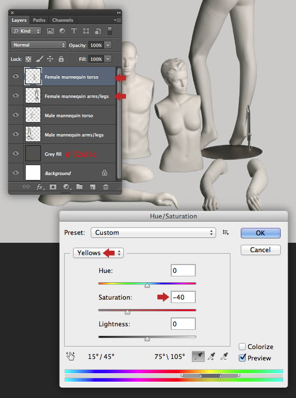 The female mannequin appears a little too yellow, so target the "Female mannequin arms/legs" layer and hit Cmd/Ctrl + U to access Hue/Saturation and reduce the Yellows Saturation to -40. Repeat this on the "Female mannequin torso" layer too.
