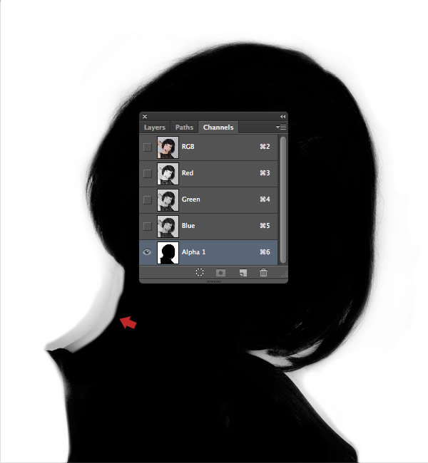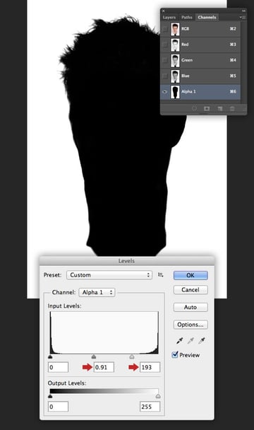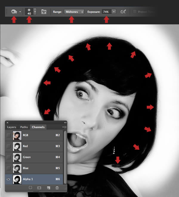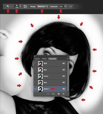 Switch to the Channels tab and you'll see the new channel ("Alpha 1") sitting at the bottom. The idea is to produce a clean silhouette, so set the Dodge Tool (O) to: Exposure: 91% / Range: Midtones and use a medium, soft-edged brush to bleach the pixels around the outer edge of the model's hair and neck.