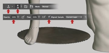 Cmd/Ctrl-click the "Additional base" thumbnail to create a layer-based selection. Set the Clone Stamp Tool (S) to Current Layer and use a small soft-edged brush to remove any scuffs and scratches from the base plate. Now use the same selection/cloning technique to fix the base plate on the "Female mannequin arms/legs" layer.
