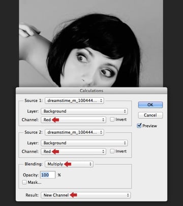 To isolate the fine hair precisely from the background we'll use a channel or density mask. If you’re familiar with my tutorials it's a technique I often use. Choose Image > Calculations. In this instance both Red channels set to Multiply produce the best contrast as a starting point for the mask. Click OK to create the new channel.