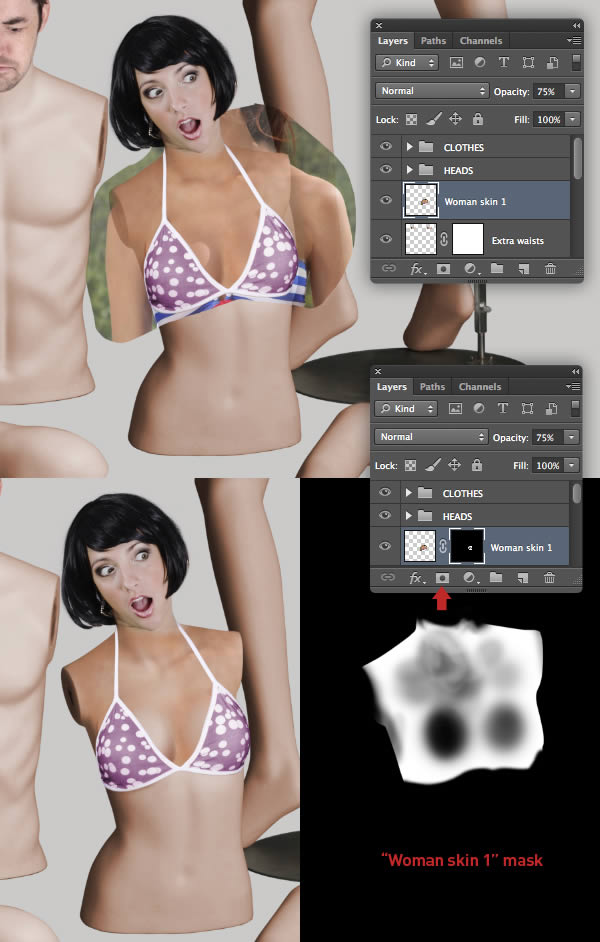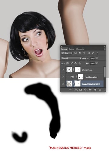 Now add a mask to the "MANNEQUINS MERGED" layer and hide areas that protrude behind the new head.