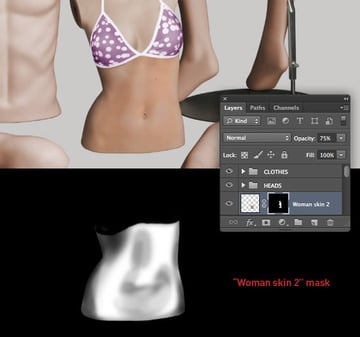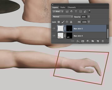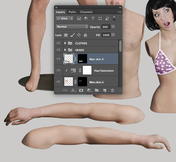 Paste to create a new layer above the "WOMAN SKIN" folder and label it "Man skin 1". Reduce the Opacity to 65%, then use a layer-based selection from "Male mannequin torso" to add a mask. Use use the same workflow as you did with the woman to Clone (S) areas and also mask the skin a little more.