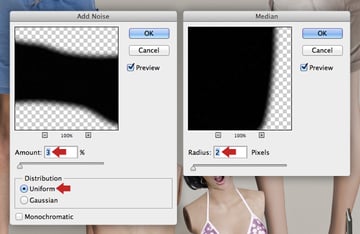 Next, we'll use a couple of filters to break up the solids and shadows a little. First, target the "Grey fill" layer, choose Filter > Noise > Add Noise and enter 3px with the Uniform option checked. Now target the "Grey grad" layer and hit Cmd/Ctrl + F to repeat the filter. Repeat this on all the shadow layers.