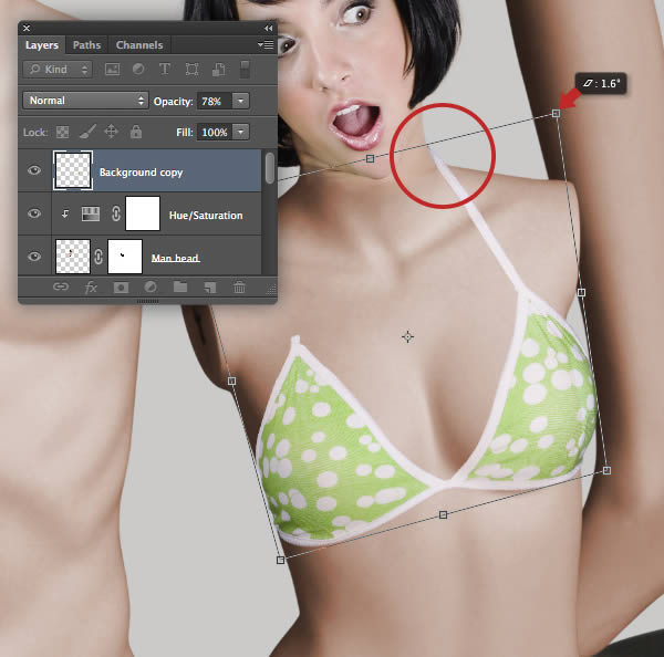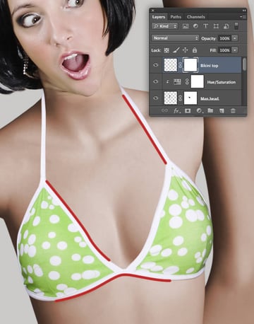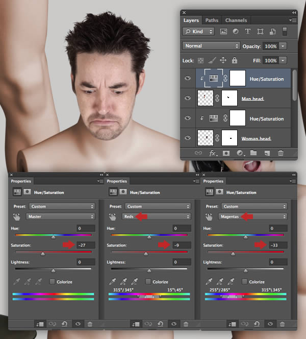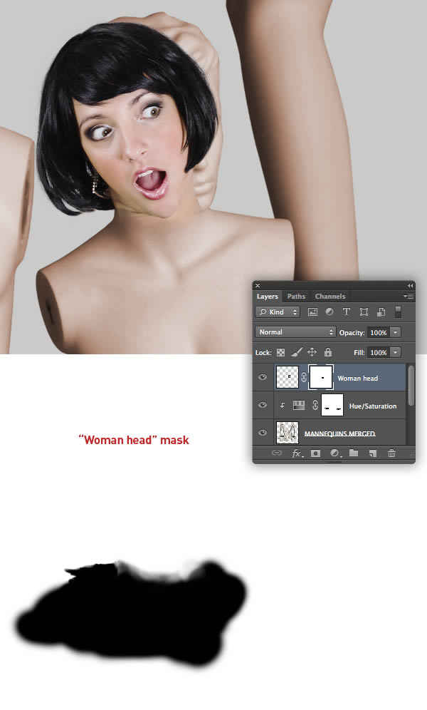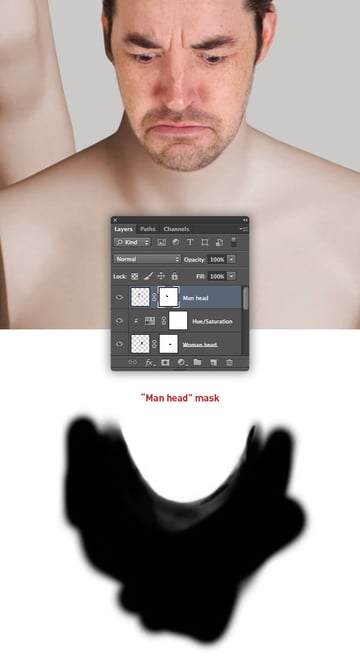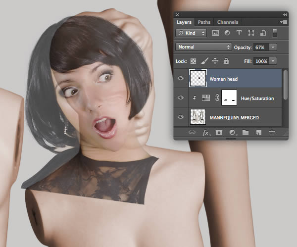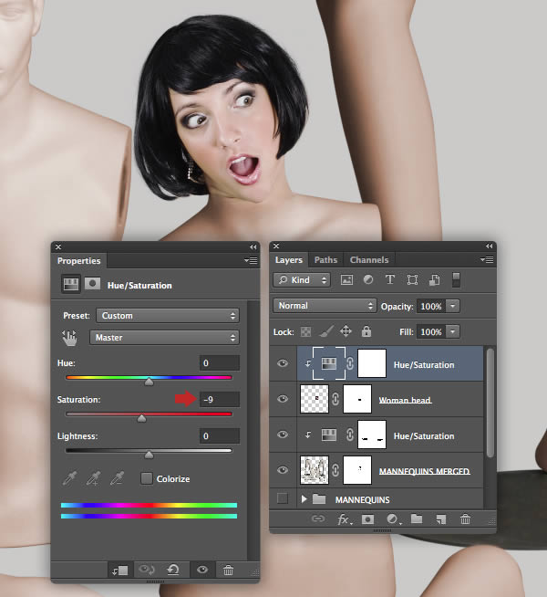 To blend the head a little more with the color of the body, clip a Hue/Saturation adjustment to the "Woman head" layer and reduce the Saturation slider to -9.