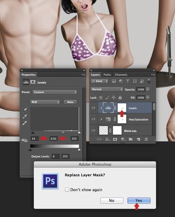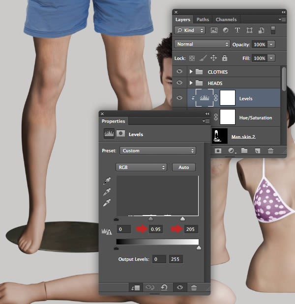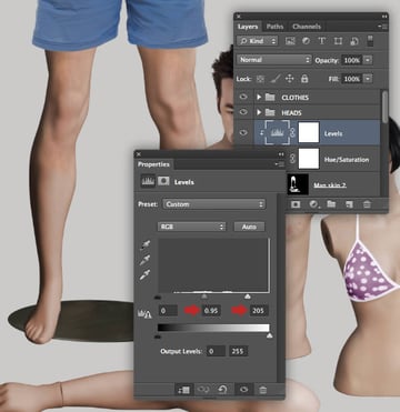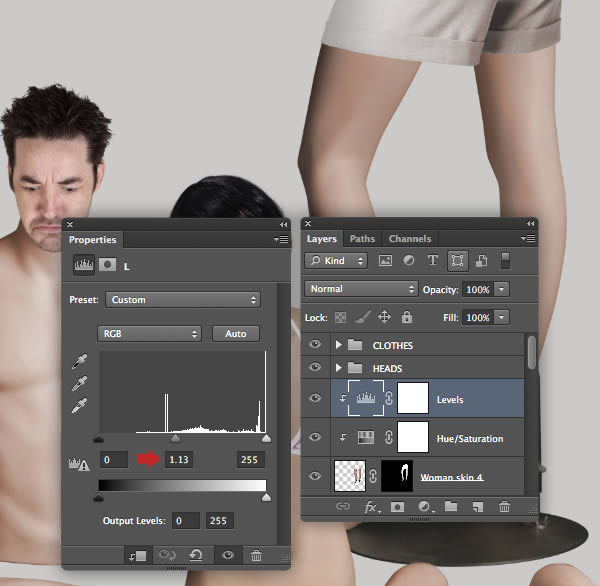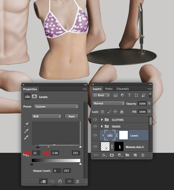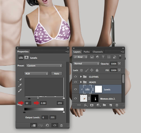 Clip a Levels adjustment to the "Woman skin 2" as shown.