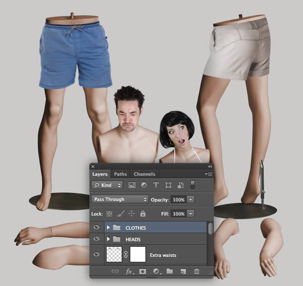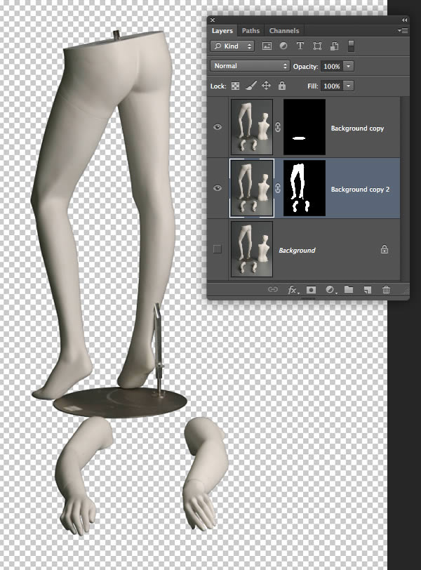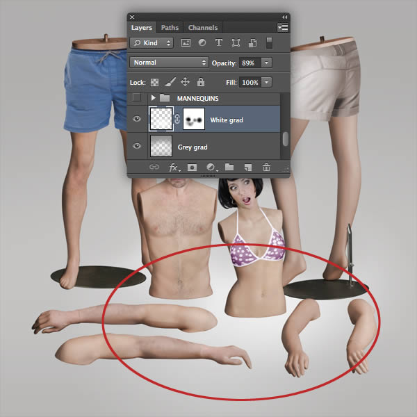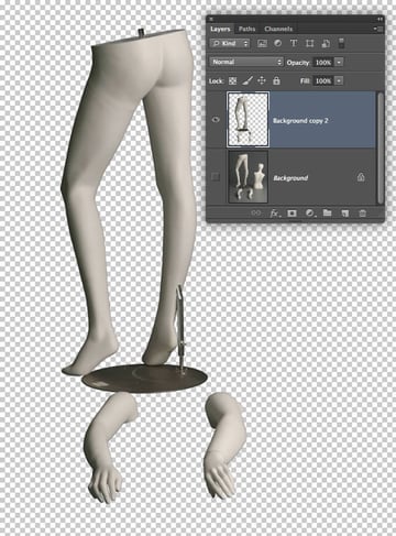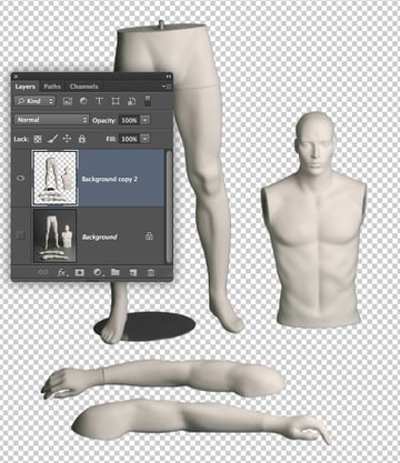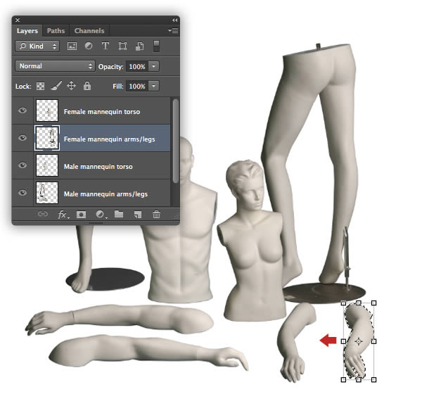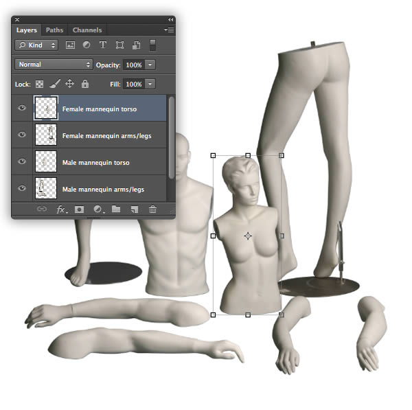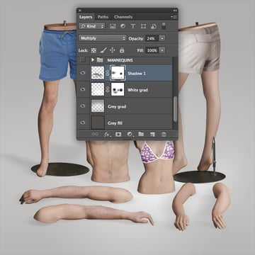 Over the next few steps we'll assemble the separate mannequin body parts into a single scene. Although we've used different elements from various photos, the consistency in lighting will make the final result more convincing.
