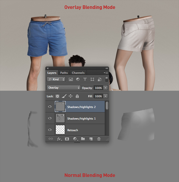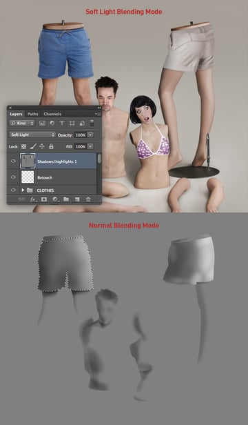 For best results, paint with black to add shadows on left of the figures first, then use an Inversed (Shift + Cmd/Ctrl + I) selection from the garments to add shadows over the legs. If you need to paint back areas of 50% grey, temporarily set the layer's Blend Mode back to Normal, pick up the color with the Eyedropper Tool (I) and paint at 100% Opacity. Finally, paint with white at 20% Opacity within selections to add highlights.