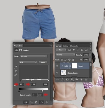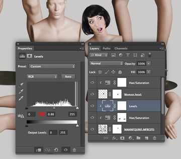 At this stage the "MANNEQUINS MERGED" layer needs a slight boost of contrast, so clip a Levels adjustment and change the midtone value to 0.88.
