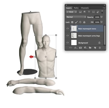 Drag over the last isolated mannequin layer into your new document and label it "Male mannequin arms/legs" Grab the Lasso Tool (L) and roughly drag a selection around the head and torso. Now press Shift + Cmd/Ctrl + J to cut the selection to a new layer. Select the Move Tool (V) and reposition to overlap the right leg as shown. Name the new layer "Male mannequin torso".