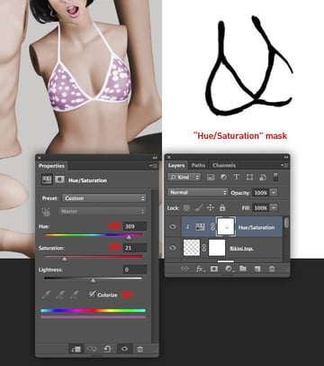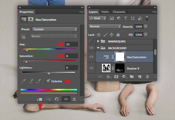Target the "MANNEQUINS MERGED" layer and choose Hue/Saturation from the drop-down Create new fill or adjustment layer icon situated at the foot of the Layers tab. In the next window activate the clipping icon so the adjustment only affects the target layer, check Colorize and apply these settings.