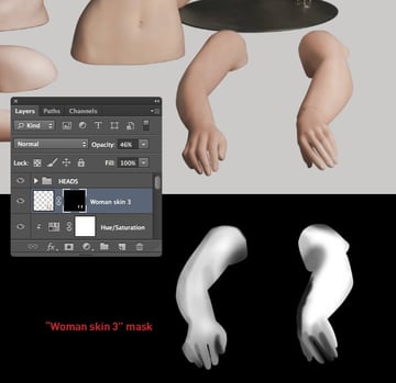 Use a layer-based selection from "Female mannequin arms/legs" to create a mask, then modify as shown. Finally, reduce the Opacity to 46% and name the layer "Woman skin 3".