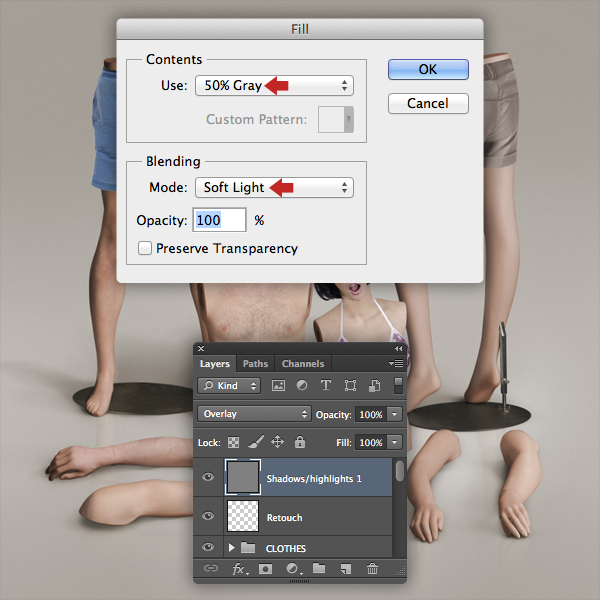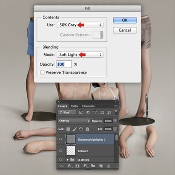 Next, we'll apply a non-destructive dodge and burn technique. First, add a top layer and label it "Shadows and highlights 1". Press Shift + F5, select 50% Gray from the Contents drop-down menu, then choose Soft Light under Mode and hit OK.