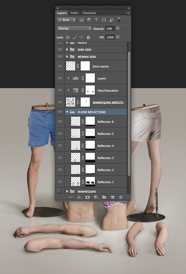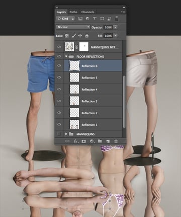 Label these layers "Reflection 1" through to "Reflection 6" and place them within a folder called "FLOOR REFLECTIONS". The folder can now be placed beneath the "MANNEQUINS MERGED" layer and the visibility of the "Background" layer and "BACKGROUND" folder enabled.