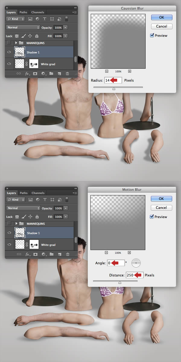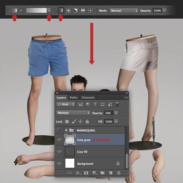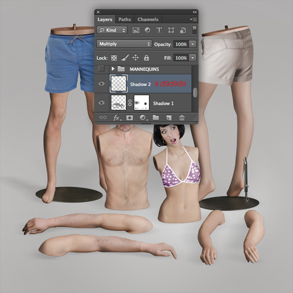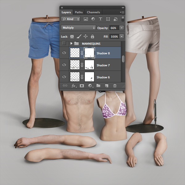Before we begin to add the floor shadows, take a look at the original mannequin images as reference – this will help establish their direction and where they fall.