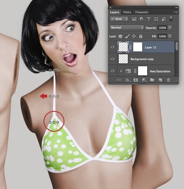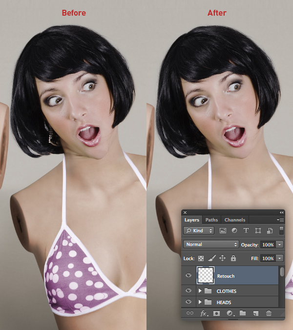 Place a new layer at the top of the stack and label it "Retouch". Set the Clone Stamp Tool (S) to Current & Below and carry out any small fixes, such as removing the woman's earring and skin creases around her neck.