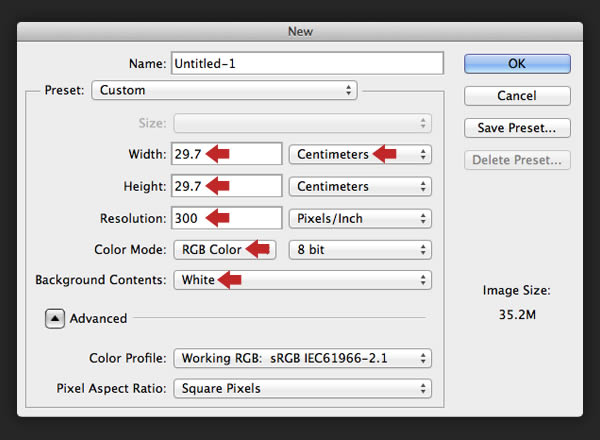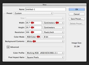 Create a new square canvas 29.7cm with the Resolution at 300dpi, the Color Mode in RGB and the Background Contents set to White.