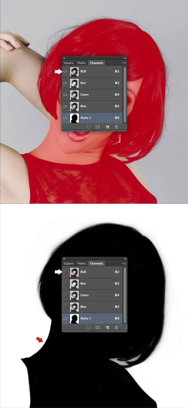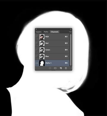 By default, white acts as selective channel areas, so hit Cmd + I to Invert the channel to negative, then use the Dodge and Burn Tools (O) again if necessary to clean up the edges of the hair.