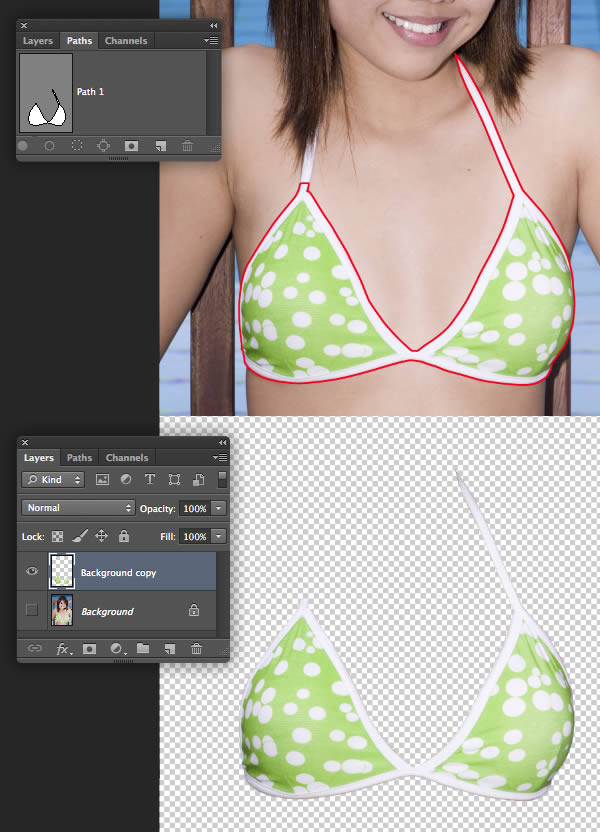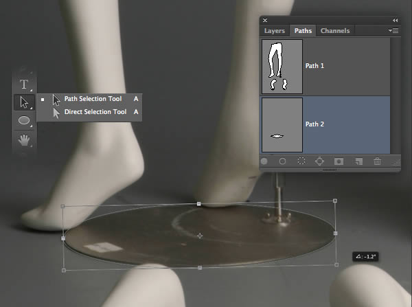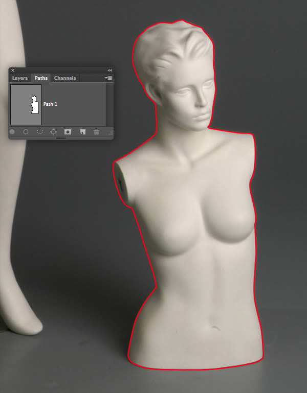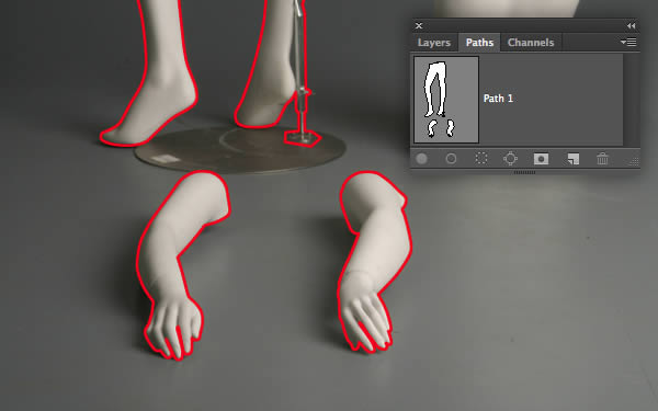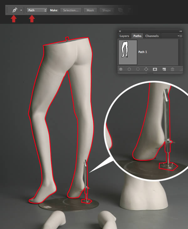Open the first mannequin image and set the Pen (P) to Path in the Options bar. Zoom right in and carefully plot a closed path around the mannequin's legs, including the support pole as indicated in red. Hold Cmd/Ctrl to access the Direct Selection tool to adjust individual direction/anchor points to fine-tune your path. Now double-click the path thumbnail and label it "Path 1;.