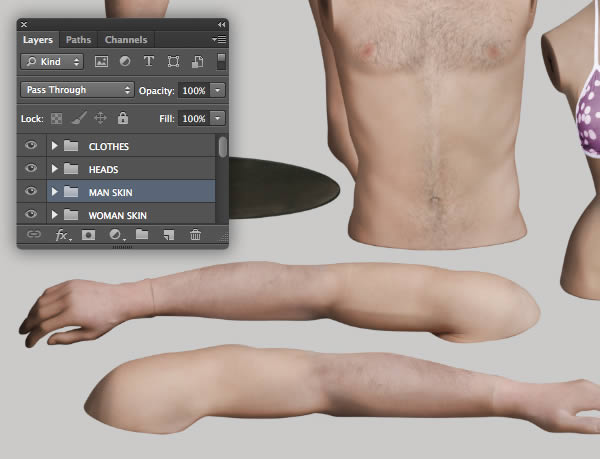 You can now place all the male textures, along with their adjustment layers into a folder called "MAN SKIN".