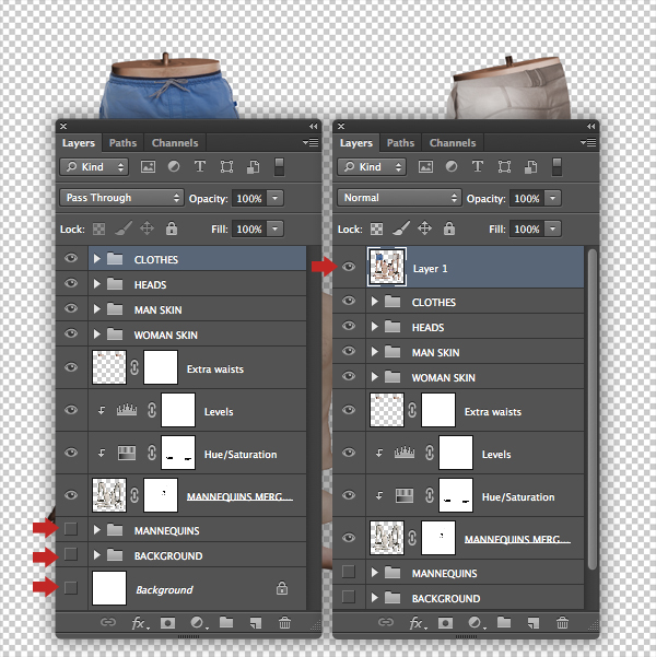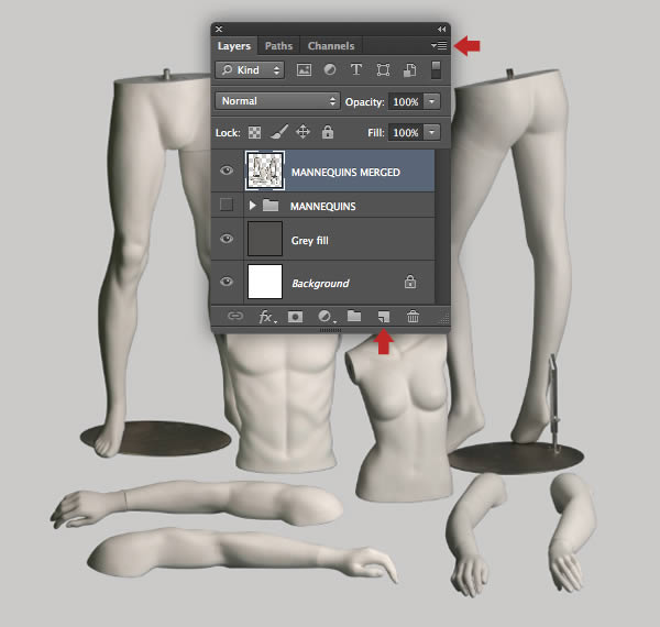 Highlight all your mannequin layers, then choose New Group from Layers from the top-right fly-out menu and name it "MANNEQUINS" in the following window. Drag the folder icon over the Create a new layer icon at the foot of the palette to duplicate it. Now hit Cmd/Ctrl + E to Merge Group and rename it "MANNEQUINS MERGED". Finally, switch off the visibility of the original folder.