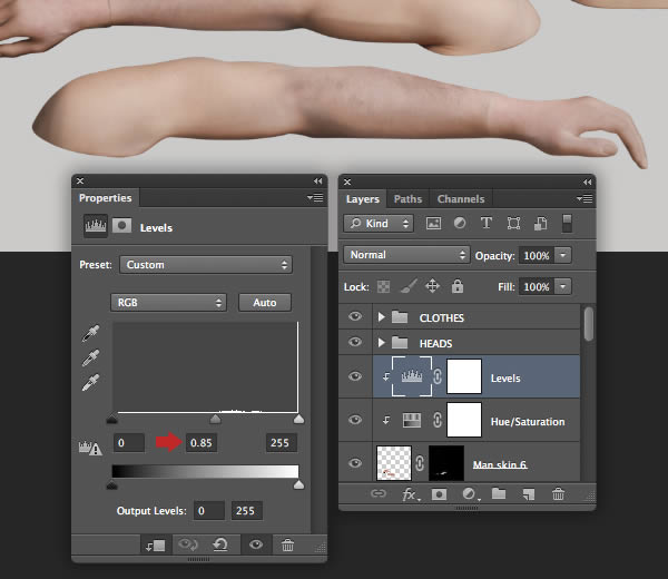 Next, clip a Levels adjustment to the same layer and use these settings to lighten the skin slightly.