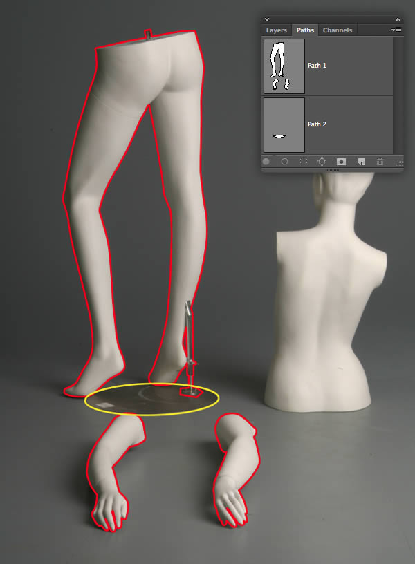 Open the third mannequin image and create two closed paths (one around the body parts and one around the base plate) exactly as you did for the first mannequin.