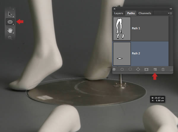 Drawing a perfect elliptical path with the Pen Tool is a little tricky. Click the Create new path icon at the foot of the Paths tab and name it "Path 2". Activate the Ellipse option found under the Shape Tool (U) and ensure it's set to Path again. Now draw an ellipse to match the base plate – don't sweat if your path is a little inaccurate at this stage, it can easily be fixed, as you'll discover next.