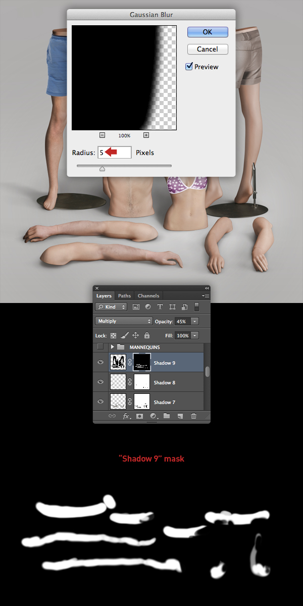 Deselect, then nudge the layer content down slightly. Choose Filter > Blur > Gaussian Blur and enter 5px to soften the edges a little. Reduce the layer Opacity to 45%, add a mask, then press Cmd/Ctrl + I to Invert the mask to black. Now use a small, white, soft-edged Brush (B) to reinstate the shadows around the bottom edges of the body parts.