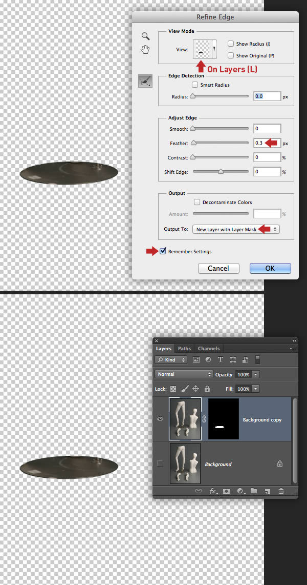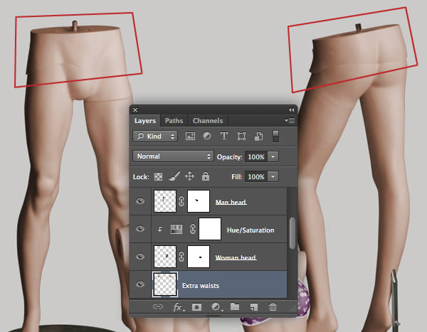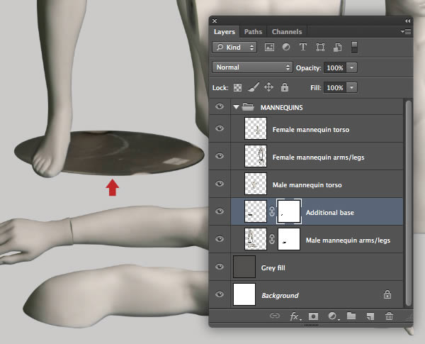 At this stage the male mannequin's base plate looks at the wrong angle; to fix this, revisit your first female mannequin layered file, generate a selection from "Path 2", then use the Refine Edge command to create a new layer. Delete/Apply the mask and add this as a new layer above "Male mannequin arms/legs".
