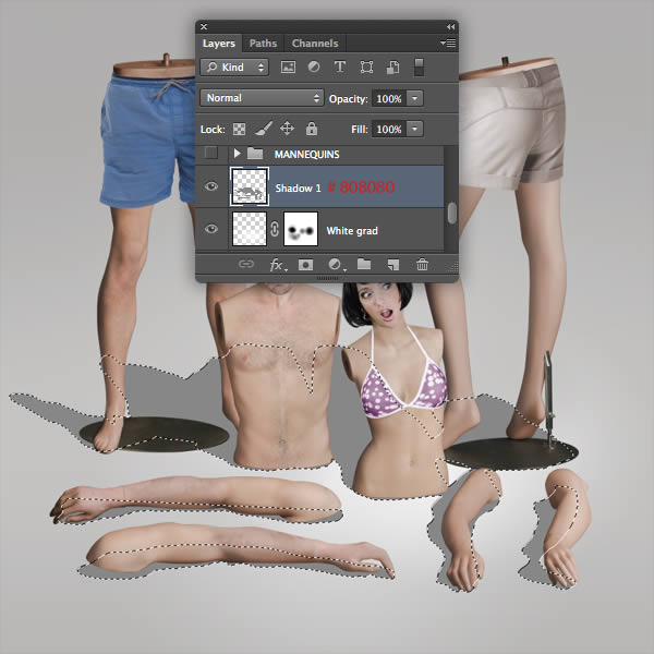 Place a final shadow layer, again in Multiply Mode. Generate a layer-based selection from the "MANNEQUINS MERGED" and fill the selection with black.