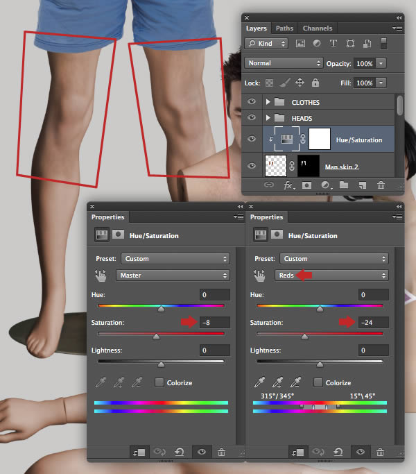 Now clip a Hue/Saturation adjustment to the "Woman skin 3" and apply the following settings.