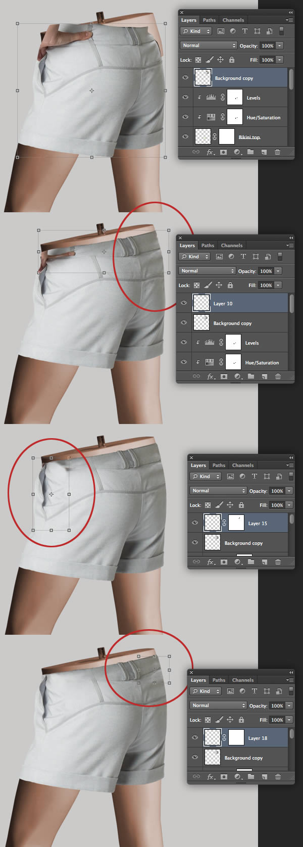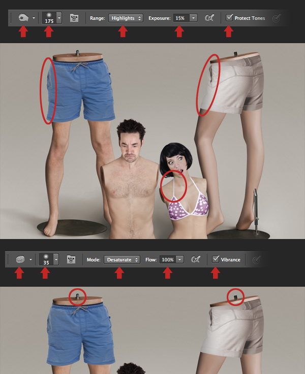We'll be adding some non-destructive darkening and lightening techniques at the end – but for now, we'll darken some white areas. Set the Burn Tool (0) to Highlights, Exposure to 15% and check Protect Tones in the Options bar. Now use a medium, soft-edged brush to darken the "Bikini top", "Woman's shorts" and the "Man's shorts" layers as circled.