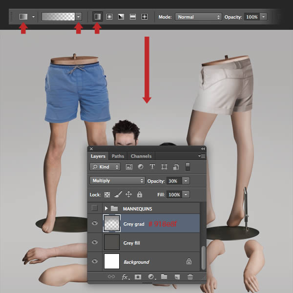 At this point we'll add a neutral grey background. Set your Foreground color to # 524f4c, then place an empty layer below all the mannequins and hit Alt + Delete to fill with the Foreground grey. Reduce the Opacity of this layer to 30% and label it "Grey fill".