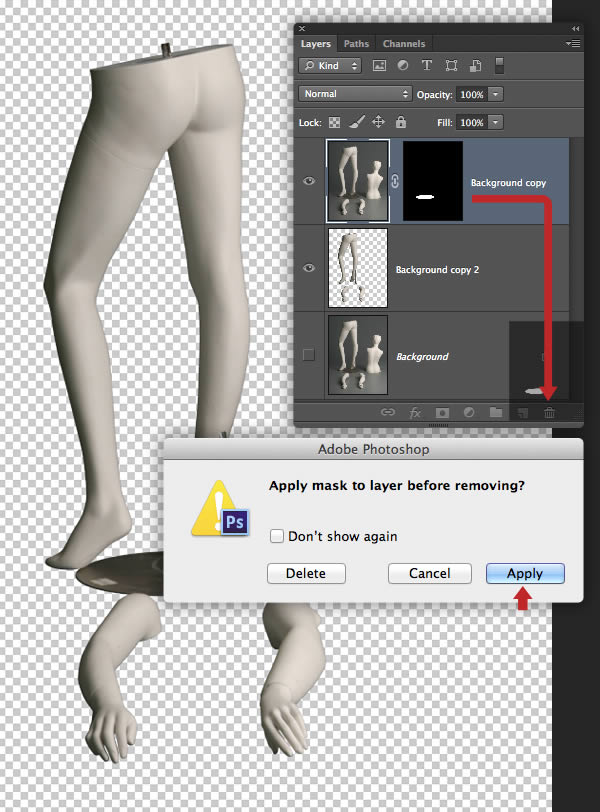 Both masks are no longer required, so drag their thumbnails into the trash icon at the foot of the Layers tab and click the Apply button in the next window.