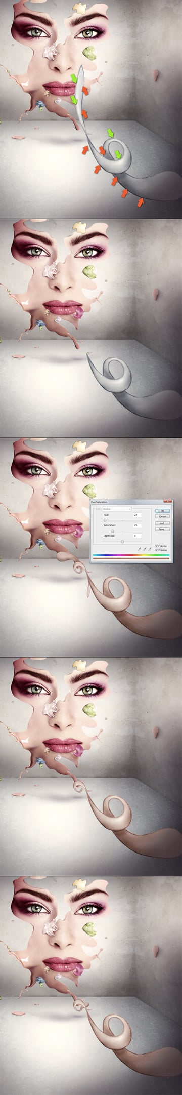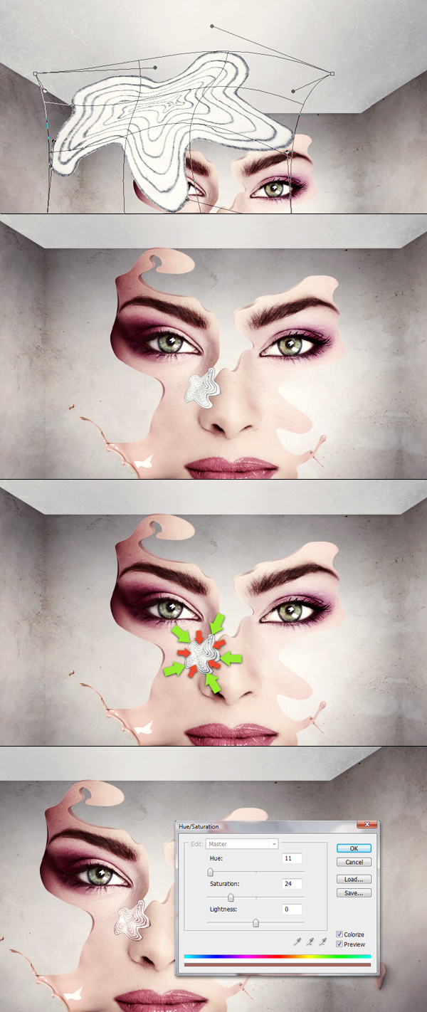 Next use Hue/Saturation and turn the Saturation halfway down (don't overdo) to match the splash color with skin color.