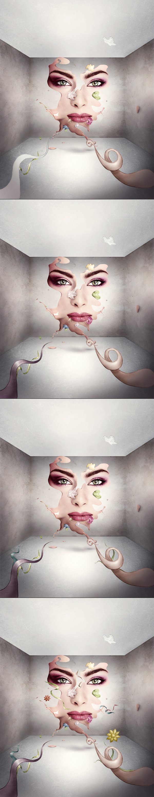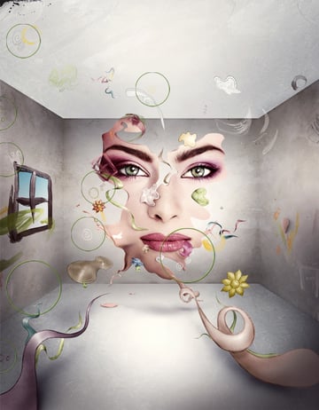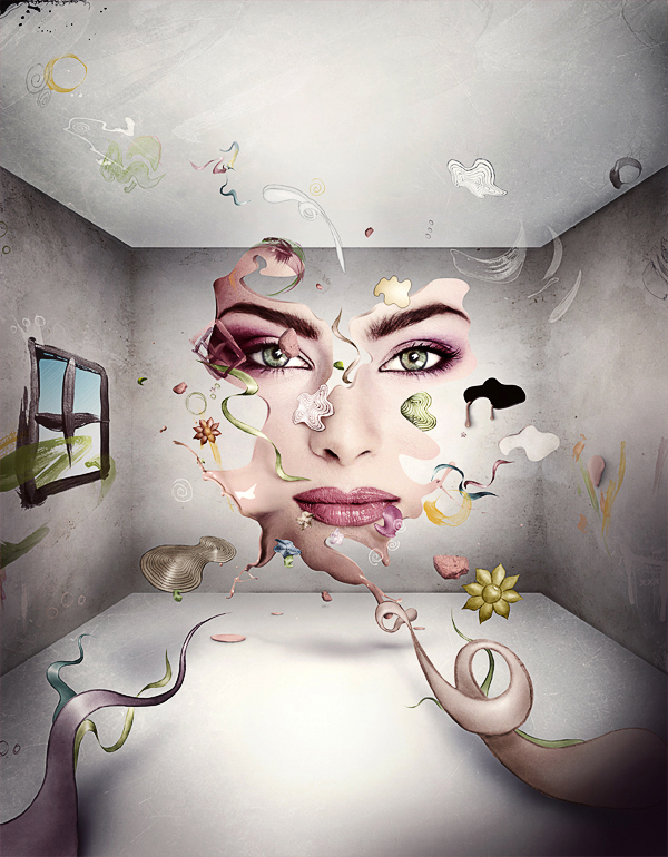 It's a themed illustration about "No Beauty," this hides an idea that no beauty lasts forever. Suddenly all that's great and beautiful falls apart. All the happiness is gone with the colorful pieces. The final outcome has its own mood, even thou it's colorful, it's still kinda frightening.