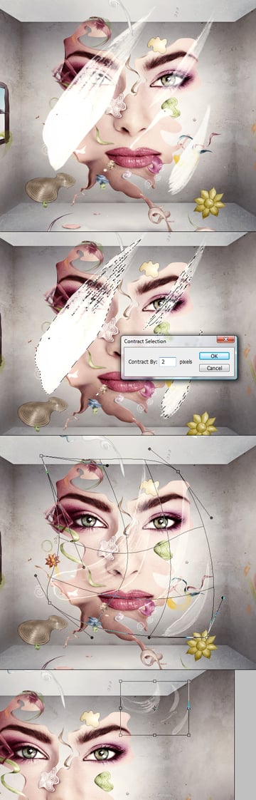 When you're done with the handmade brushes go back again to our paint stroke brushes, use white for the color and apply one big brush on a new layer (first image below). Then call the selection of this brush by Command-clicking on the layer thumbnail, and go to Select > Modify > Contract, use the value of 2 (second image below). Next, bend it with Command + T and select Warp in the top menu (third image below). Now resize it down (use Command + T) and place it in the space.