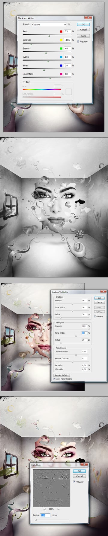 First Image Below: As a final touch-up, add a Layer Adjustment of Black and White in the Layers Palette (on the top of all layers), change it's Opacity the way you like (around 30-50%) and set the Blending Mode to Soft Light.