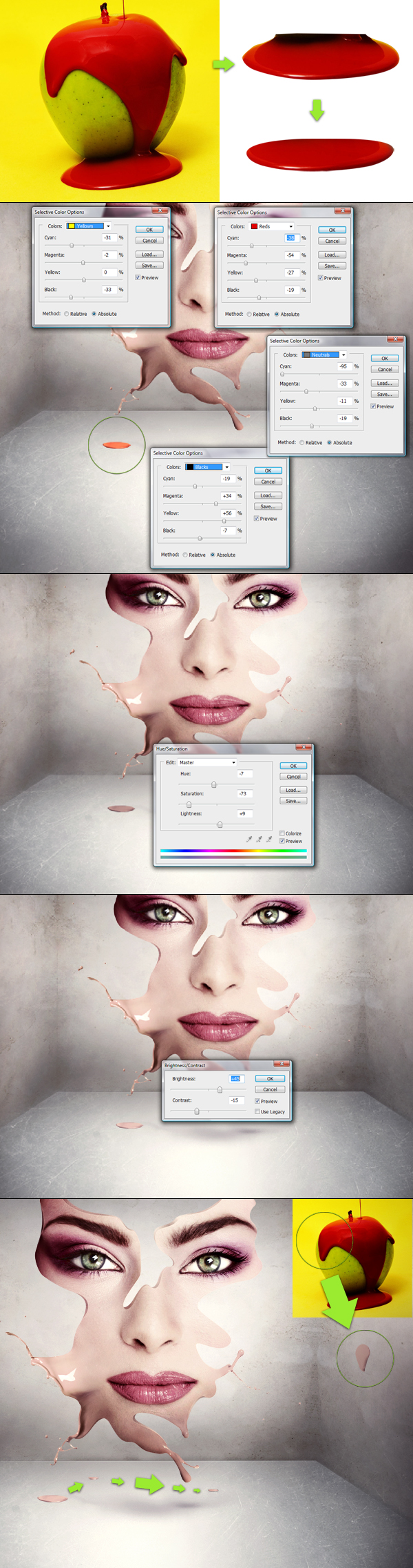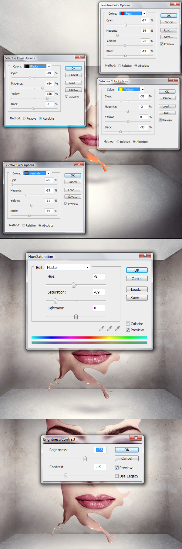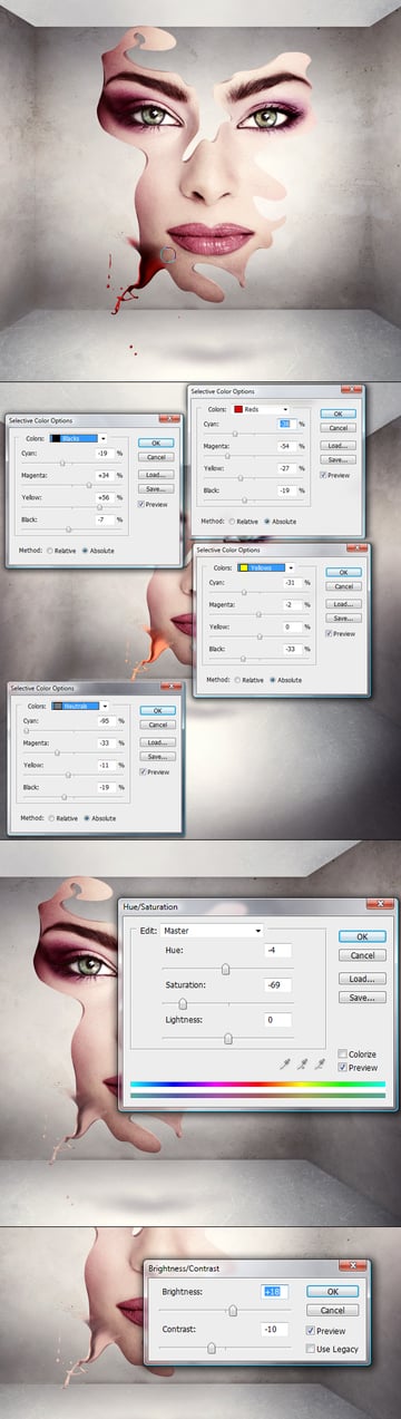 Now as I said we just need a little bit of this splash, so make it fit into the face and use a soft eraser or a layer mask to get rid of the square edge of the splash (first image below). Then apply Image > Adjustments > Selective Color and brighten all the tones in this dark red splash. To do this we need to use Reds, Yellows, Neutrals, and Blacks (second image below). Now this looks over saturated, so let's take the saturation down (third image below). Then it's good to give a little more brightness (forth image).
