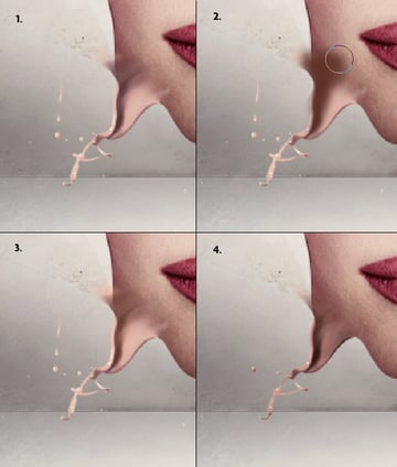 OK, let's bring up another splash. Again use the Pen Tool to make a precise cut out. Now turn it in the right direction (first image below). Then use a hard eraser (or layer mask with a hard, black brush) to make a perfect match to the skin (second image below). Then soft-erase the squared top part of the splash.