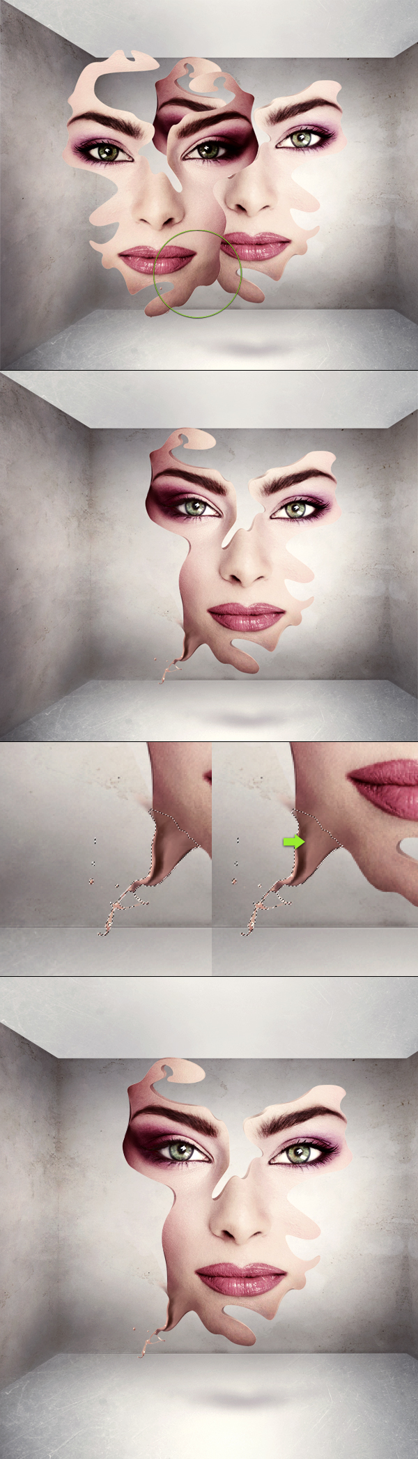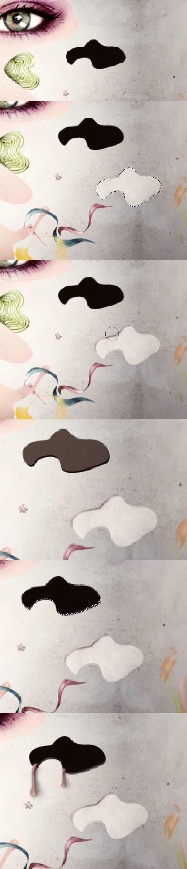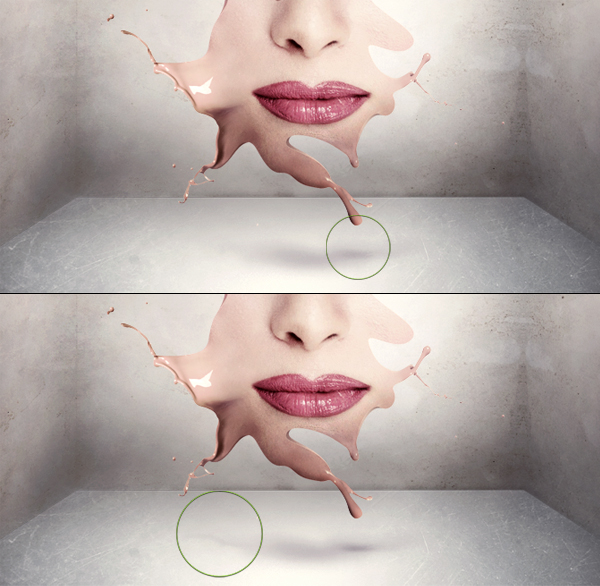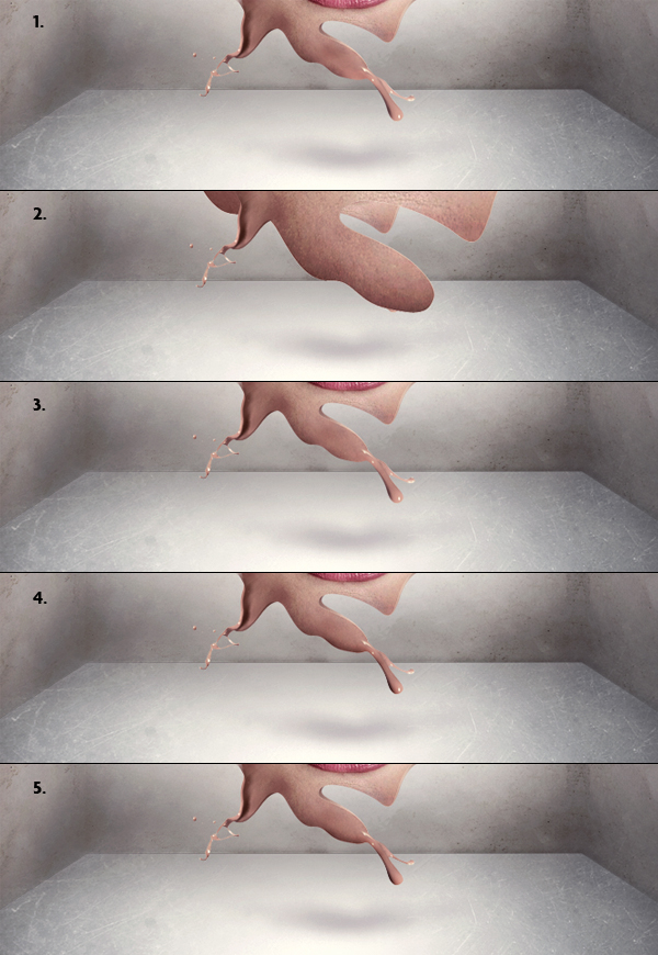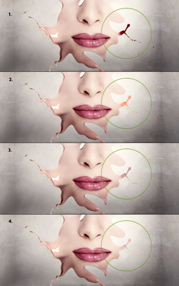 Copy the skin splashes that we made in the beginning (you can also resize down after copying) and place them dripping from our hole. Use the Burn Tool (set to Midtones) to make it fit the splash top parts to the black hole's background. Then add some shadow under these drips (same way as you've created shadow in the previous steps).