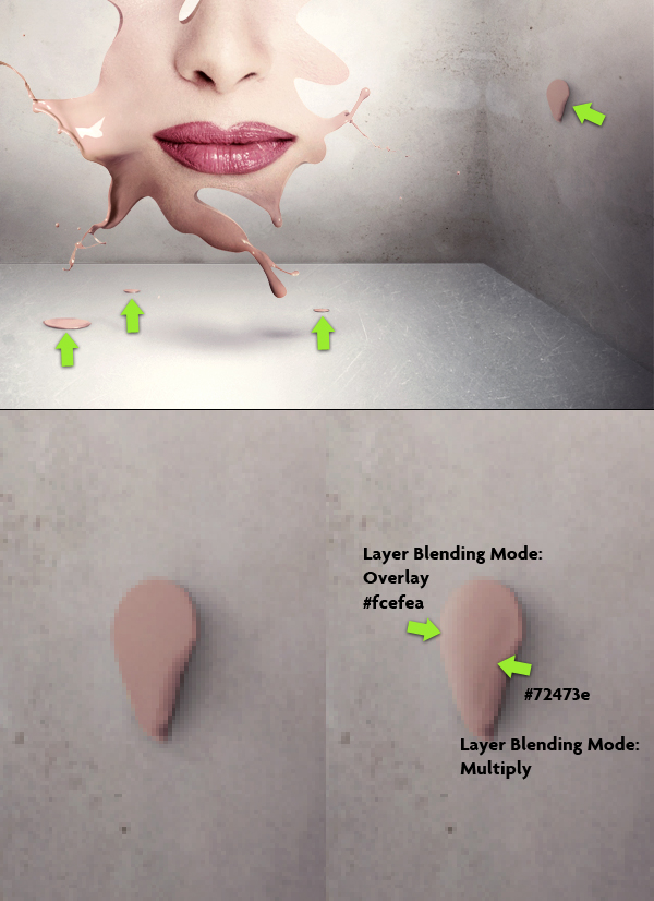 Then look at second image below and create two new layers above the skin parts. We will make a small touch up to one of them. As shown in the image - change these layer Blending Options: one to Overlay and the second to Multiply. Then using the same soft brush, change your color as shown in the second image below and paint in the indicated spots to make this skin look more realistic.