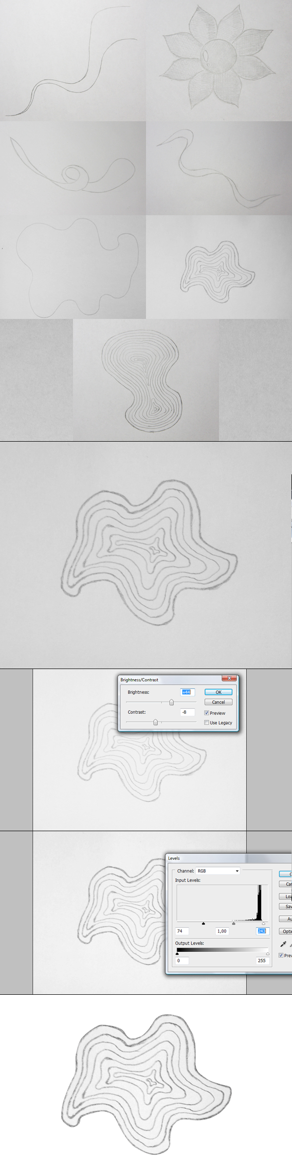 So take a piece of paper, a pencil and use your imagination to create some nice shapes (or you can use mine as well). Now shoot a photo of each one (it's good to have natural daylight while taking a picture). Then open each one and if they are too dark, use Layer > Adjustments > Brightness/Contrast and then Layer > Adjustments > Levels to get a nice contrast between the edges and the background. Next use the Pen Tool to extract. While extracting, work on a big canvas (don't resize the photos).